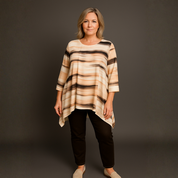 Cream Brown Hanky Hem 3/4 sleeve blouse