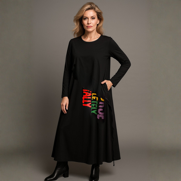 Black Jersey Dress With Cotton Overlay and Bold Writing