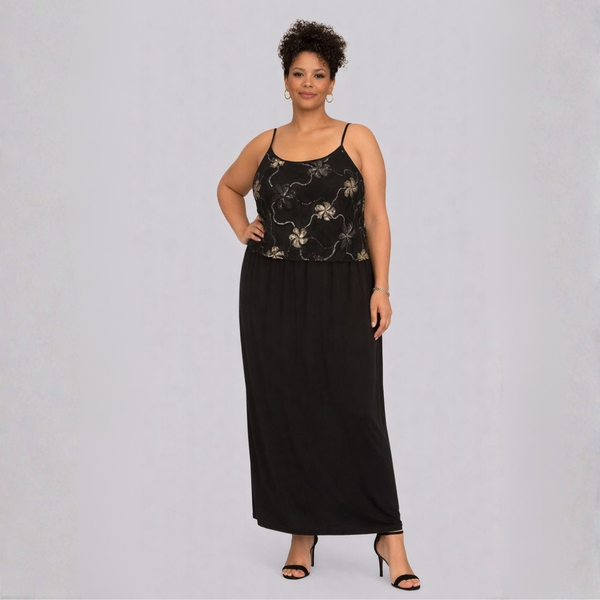 Black Strappy Maxi Dress with Silver Embroidered Overlay Top