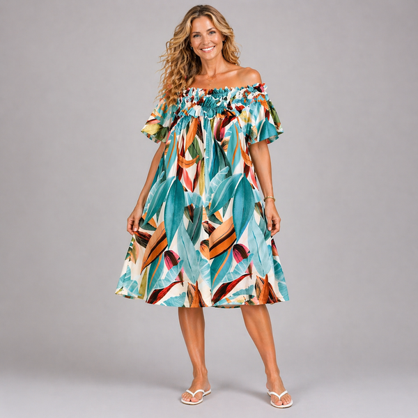 Bright Leaf Print Elastic Waist Gypsy Style Calf Length Dress