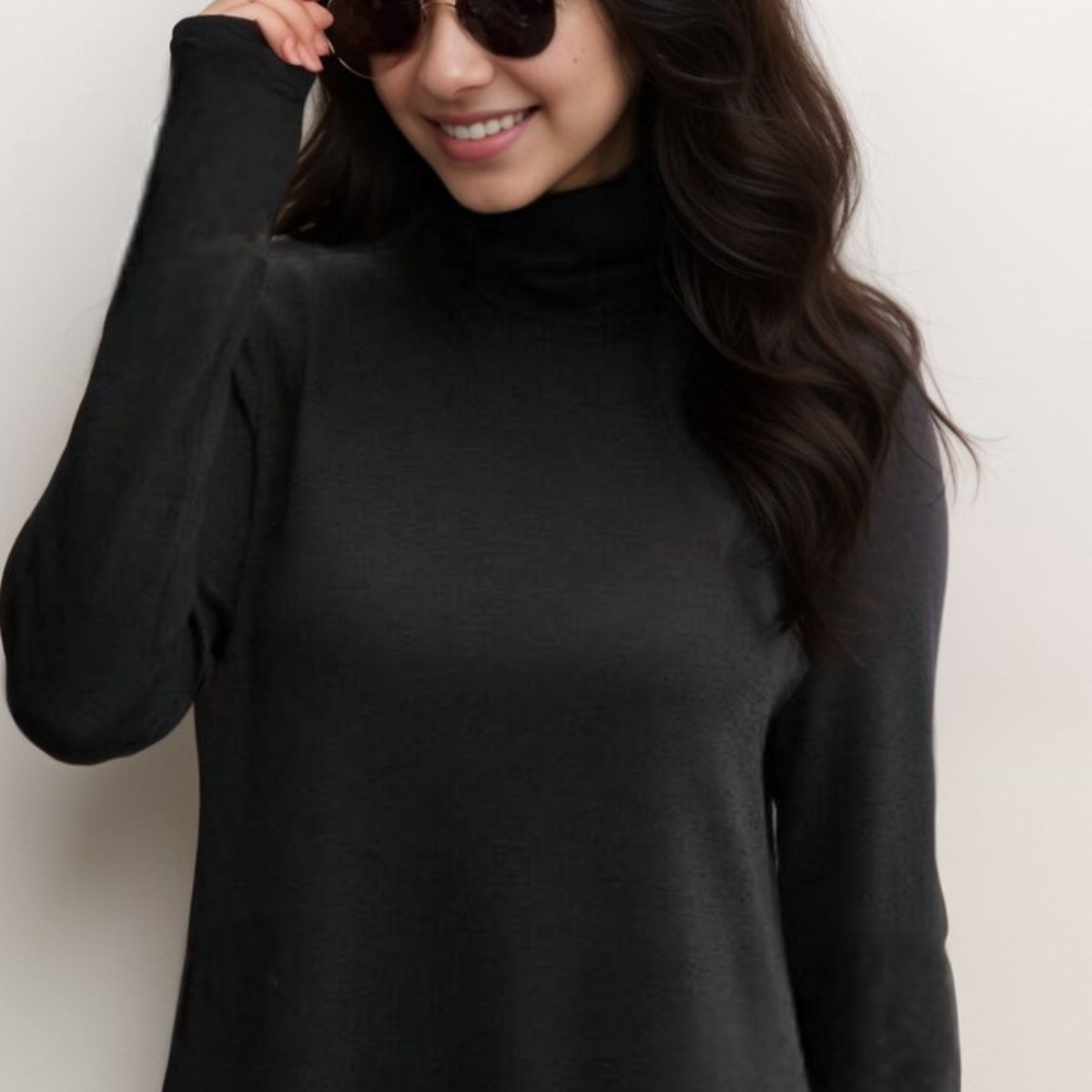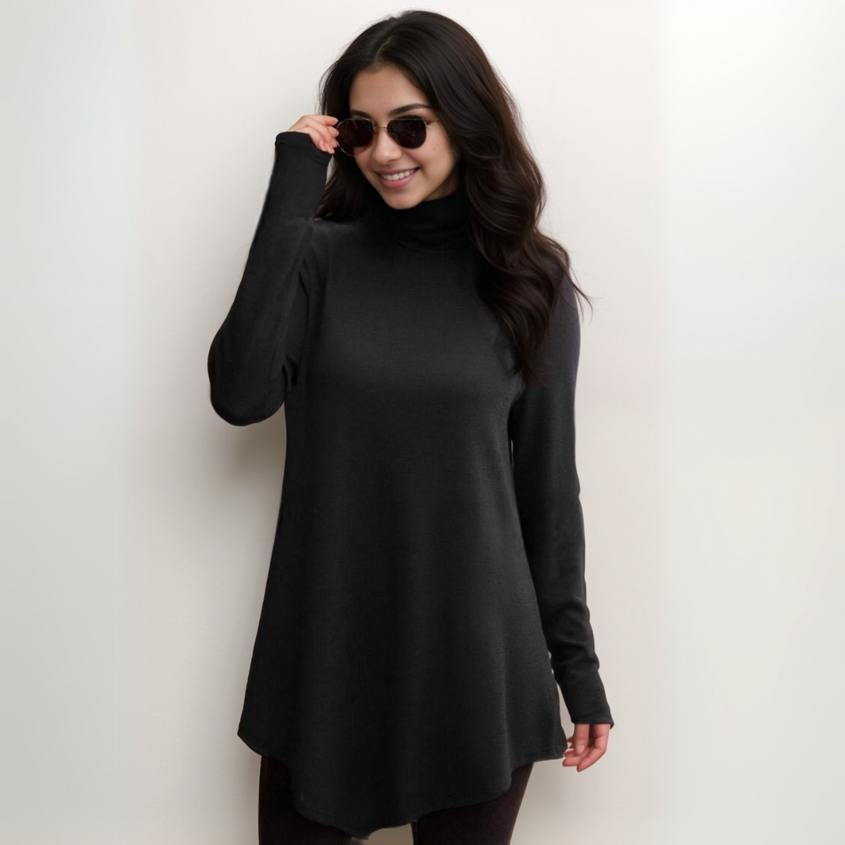Experience long-lasting comfort and effortless style with our BLACK POLO NECK V HEM JUMPER / TOP from ROCKTHOSECURVES. This top features a V hem design on both the front and back, along with long sleeves and a soft, fine knitted material. Embrace the perfect combination of fashion and coziness with this must-have piece.