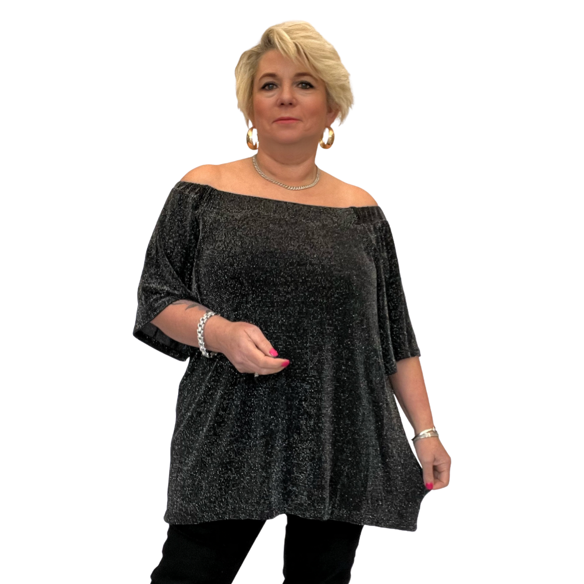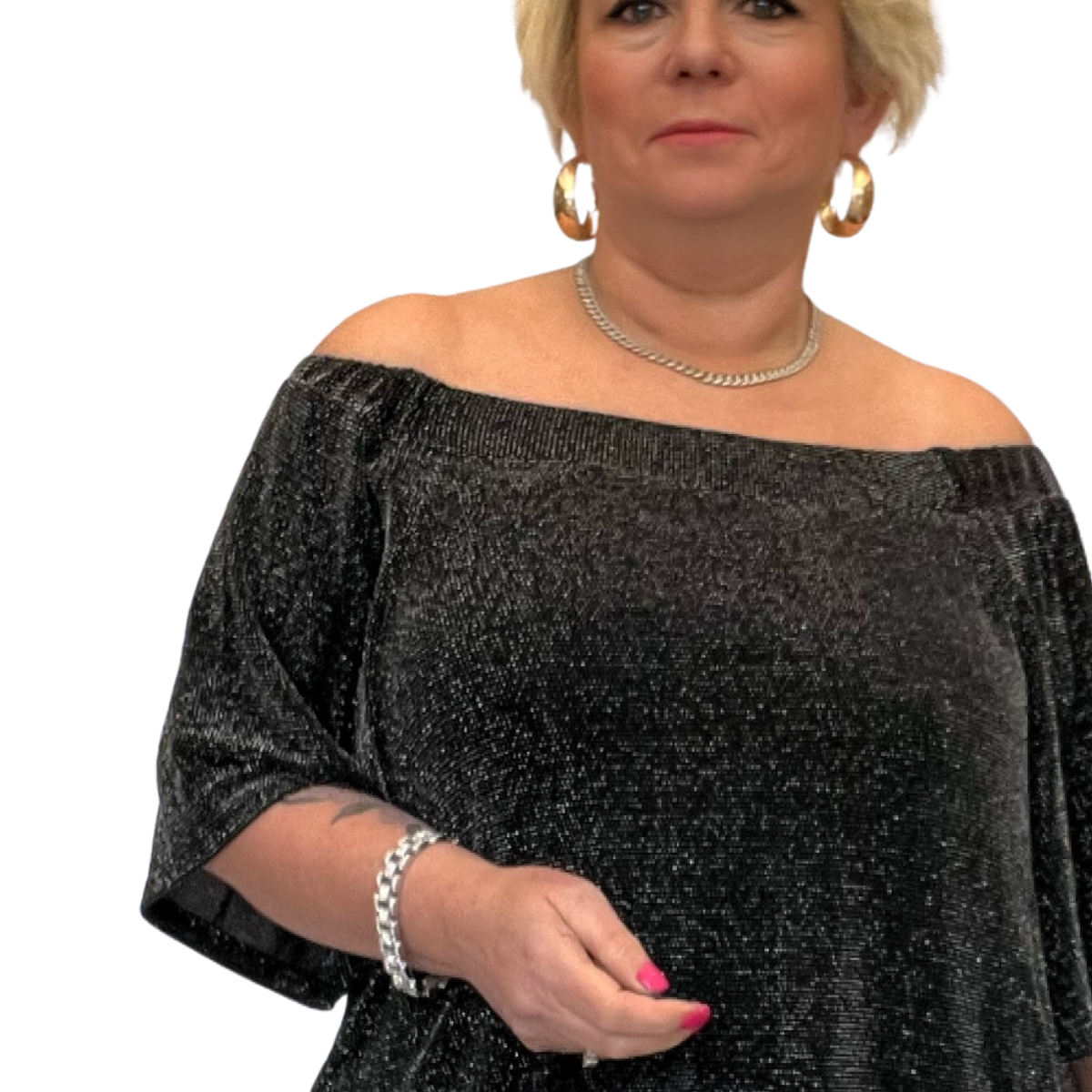Step out in style with our breathtaking BARDOT OFF SHOULDER TRUMPET SLEEVE SPARKLY TOP. This stunning top features a flattering off-shoulder design and playful trumpet sleeves that add an extra touch of glamour. Perfect for any evening party, this top effortlessly combines comfort with style. Slip on this loose fit A-LINE top and feel confident and fabulous all night long. Its 1/2 sleeve length and great length make it a must-have addition to your wardrobe. Don't miss out on this must-have plus size top from Rockthosecurves!