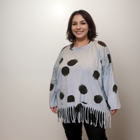 Add a touch of style and fun to your wardrobe with this BLUE LARGE SPOT TOP WITH TASSEL HEM. This round neck loose fitting top features a playful tassel hem that will elevate any outfit. Make a statement and stand out with this trendy top from Rockthosecurves!