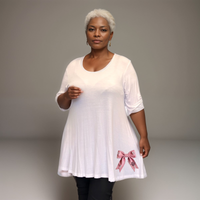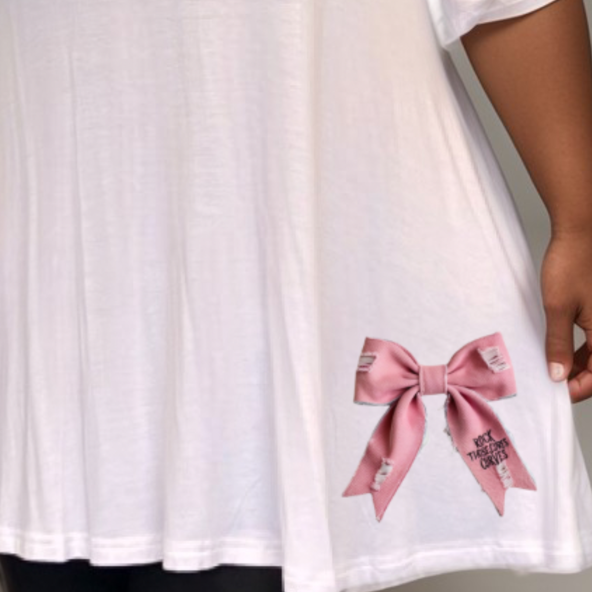 Elevate your style with our 3/4 button sleeve swing top featuring DISTRESSED PINK BOW SWING TOP on the front. This flattering A-line top has a perfect length, making it a must-have addition to your wardrobe.