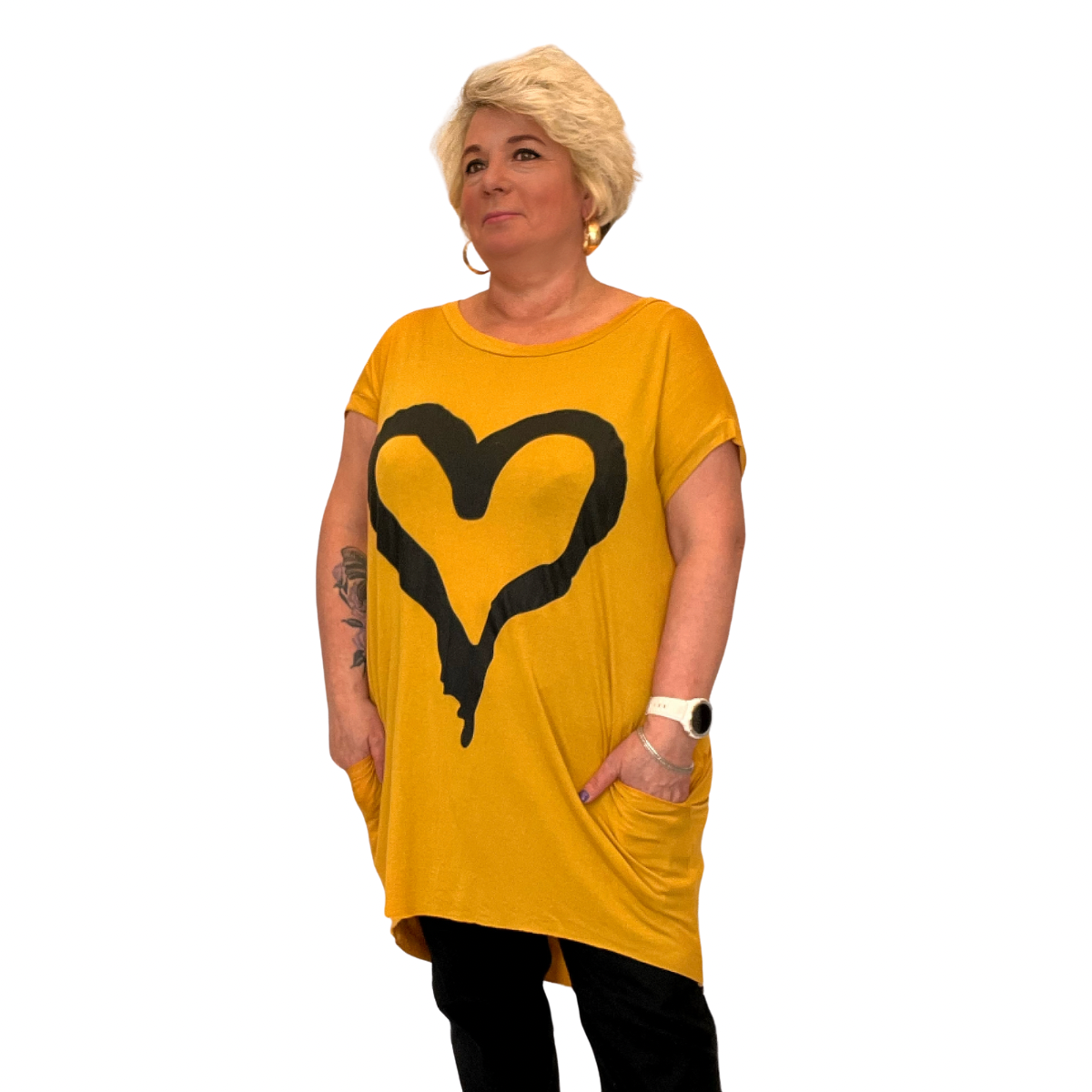The standout feature? A large heart print on both the front and back that turns heads from every angle. Made from soft, breathable fabric, it’s perfect for everyday wear while keeping you stylish and confident.