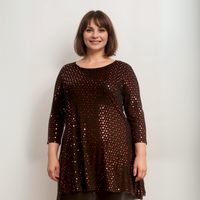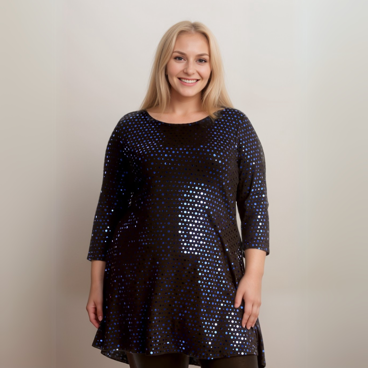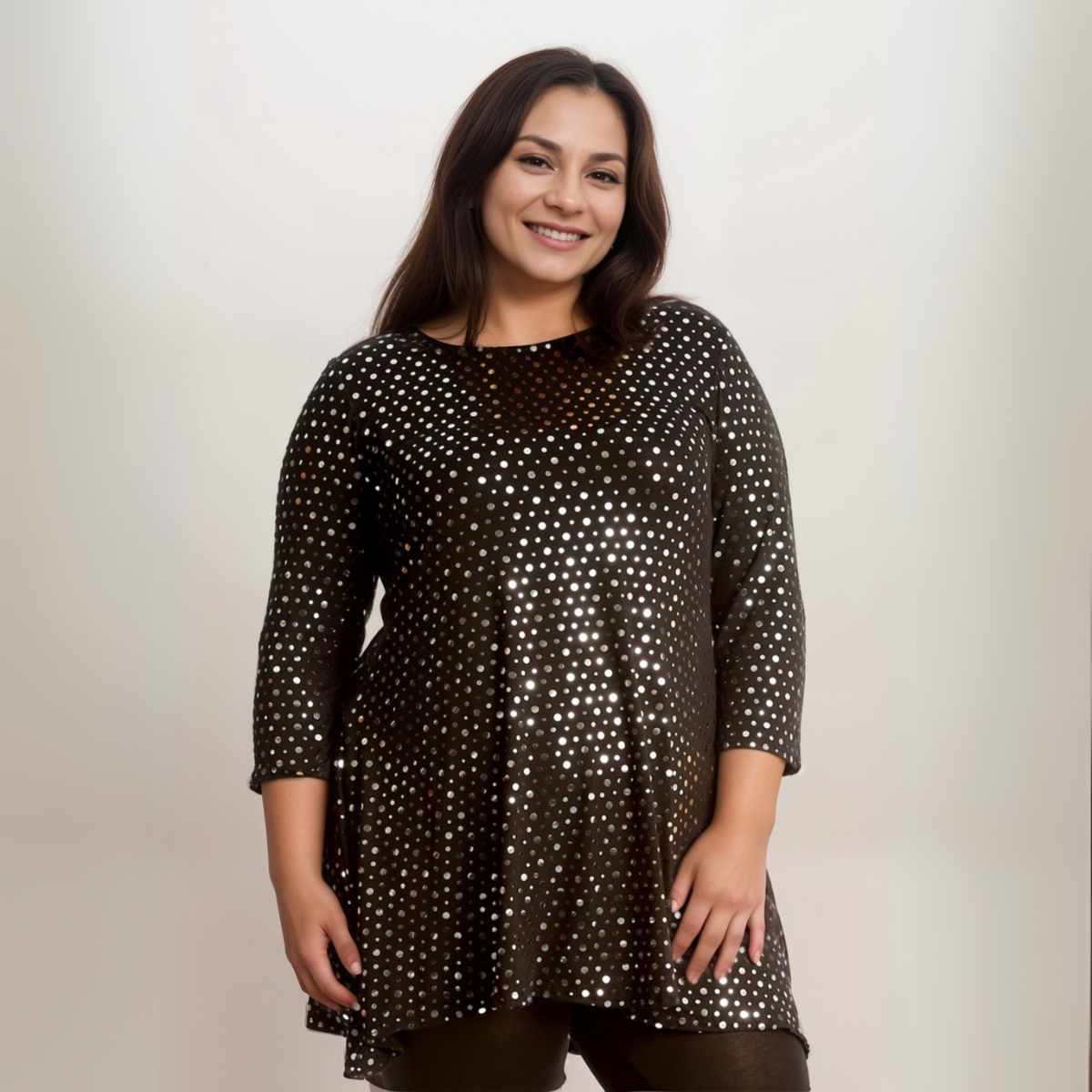 This incredible FOIL SEQUIN 3/4 SLEEVE SWING TOP is the perfect party style for those who want to make a statement! With its soft and comfortable feel, A-line swing style, and eye-catching foil sequins, this top will surely turn heads. And with its great length, it's a must-have for any occasion. From ROCKTHOSECURVES, the home of chic and stylish fashion.