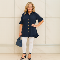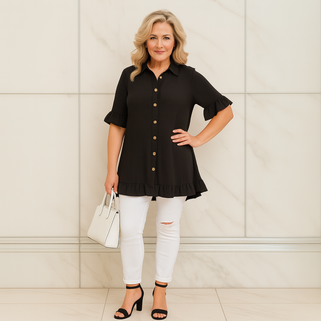 The frilled edge detailing brings a feminine flair, while the short sleeves and smart collar add a polished touch. Its longer length makes it a versatile wardrobe staple – ideal for pairing with jeans, skirts, or tailored trousers for any occasion.