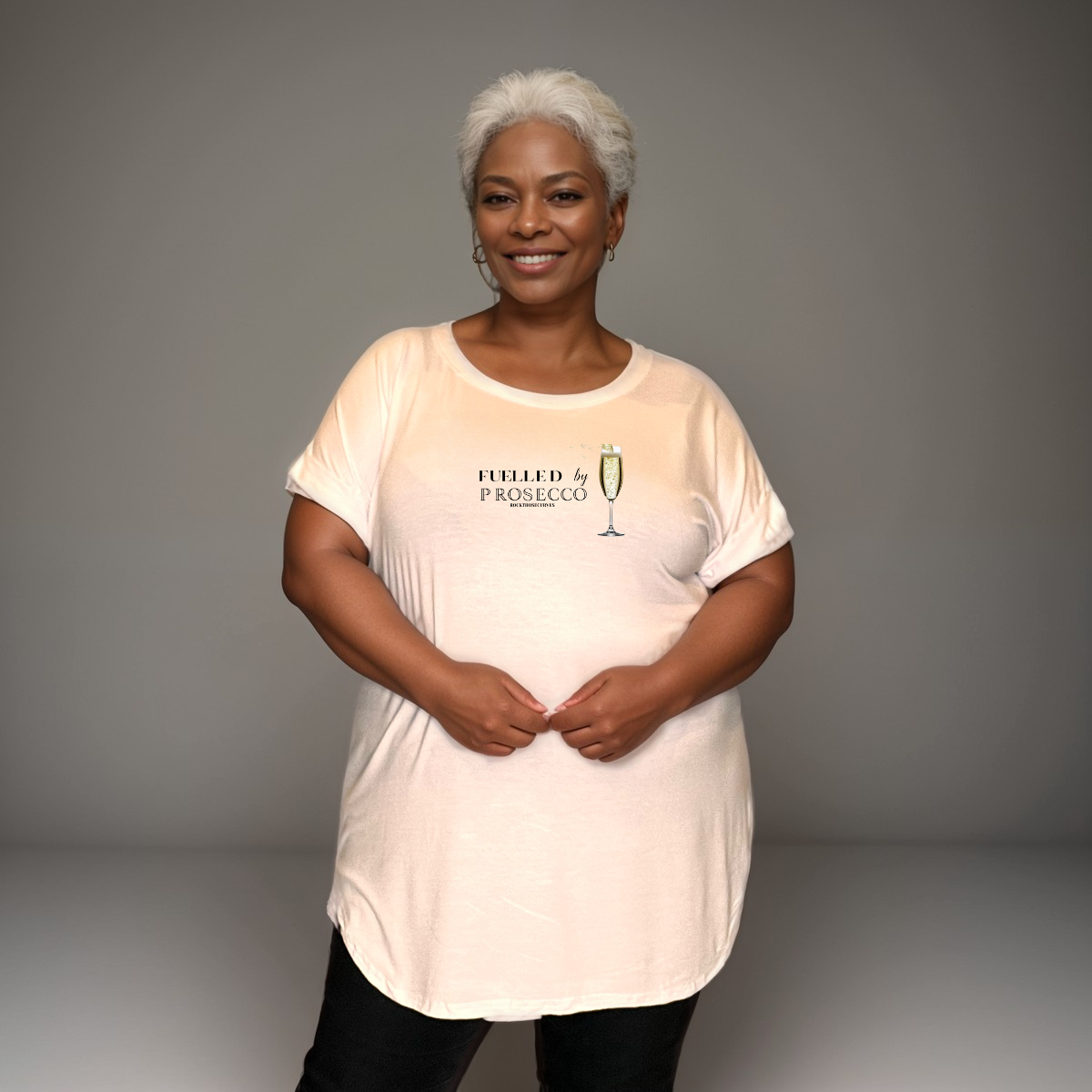 Introducing the FUELLED BY PROSECCO DIPPED HEM T-SHIRT, designed with rolled cap sleeves and a dipped hem for a stylish touch. The length is perfect, and the fun logo on the front adds a touch of humour. This shirt is a must-have for those who believe in enhancing their curves and making a statement. Get ready to rock your curves and turn heads with this incredible tee!