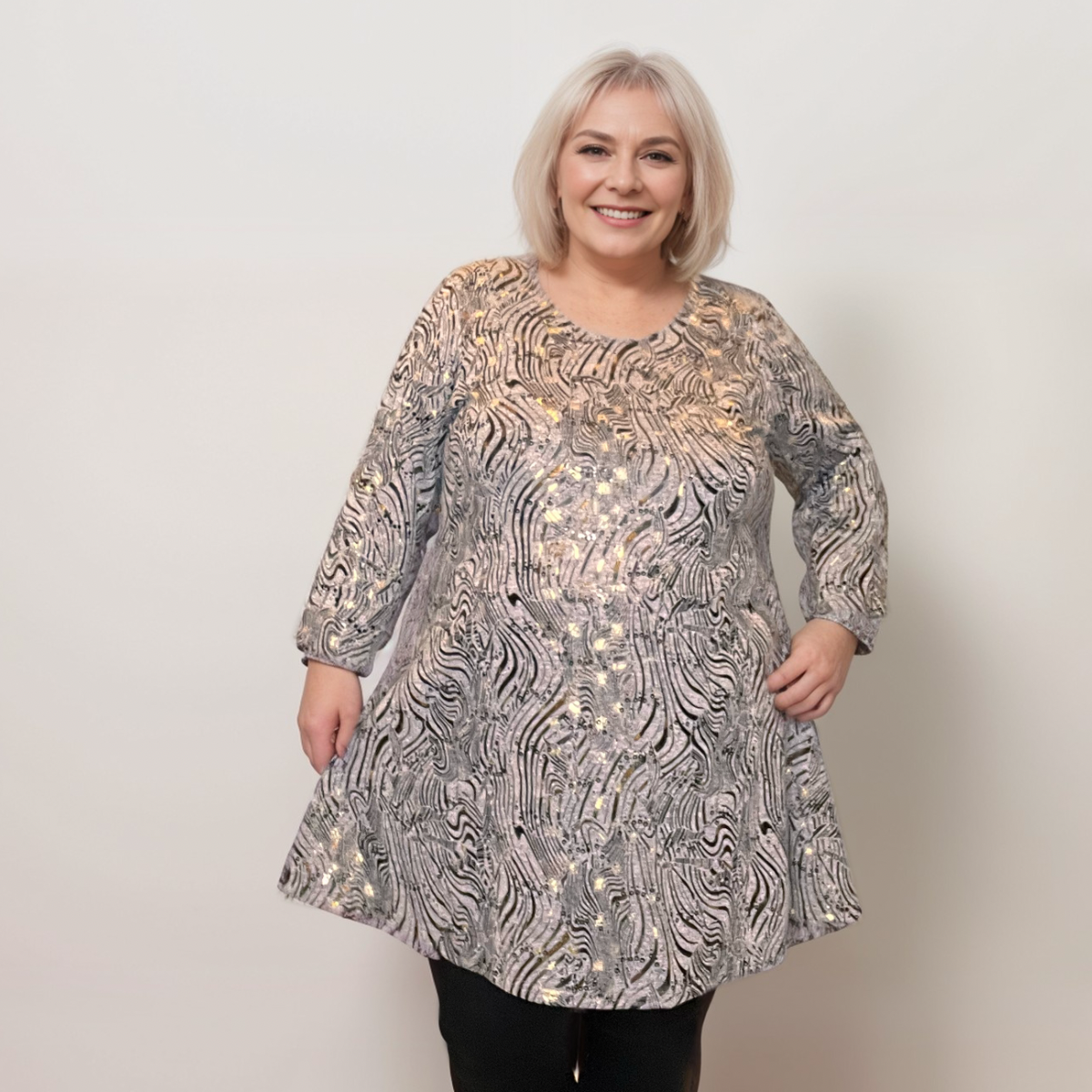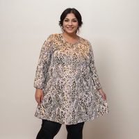 Experience the glamour of this 3/4 sleeve round neck A-line swing top from RockThoseCurves. Featuring a stunning foil bronze pattern with black sequins, this swing top is the perfect blend of style and comfort. Elevate your wardrobe with this great length top and add a touch of sparkle to your outfit. Don't miss out on this must-have piece! Grey Animal has no sequins