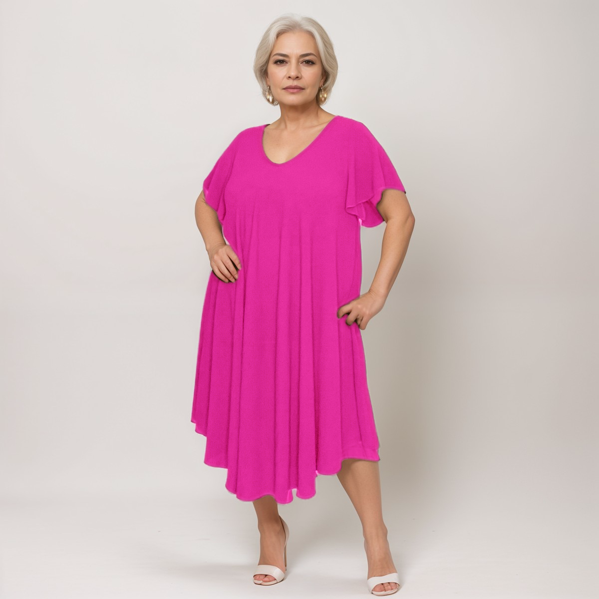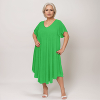 Twirl into effortless style with the RockThoseCurves Plus-Size V-Neck Swing Dress—your new go-to for comfort and flair. Crafted from a soft stretch-blend, this dress features a flattering V-neck, fluted short sleeves that flutter with every move, and an A-line swing silhouette that celebrates your curves.