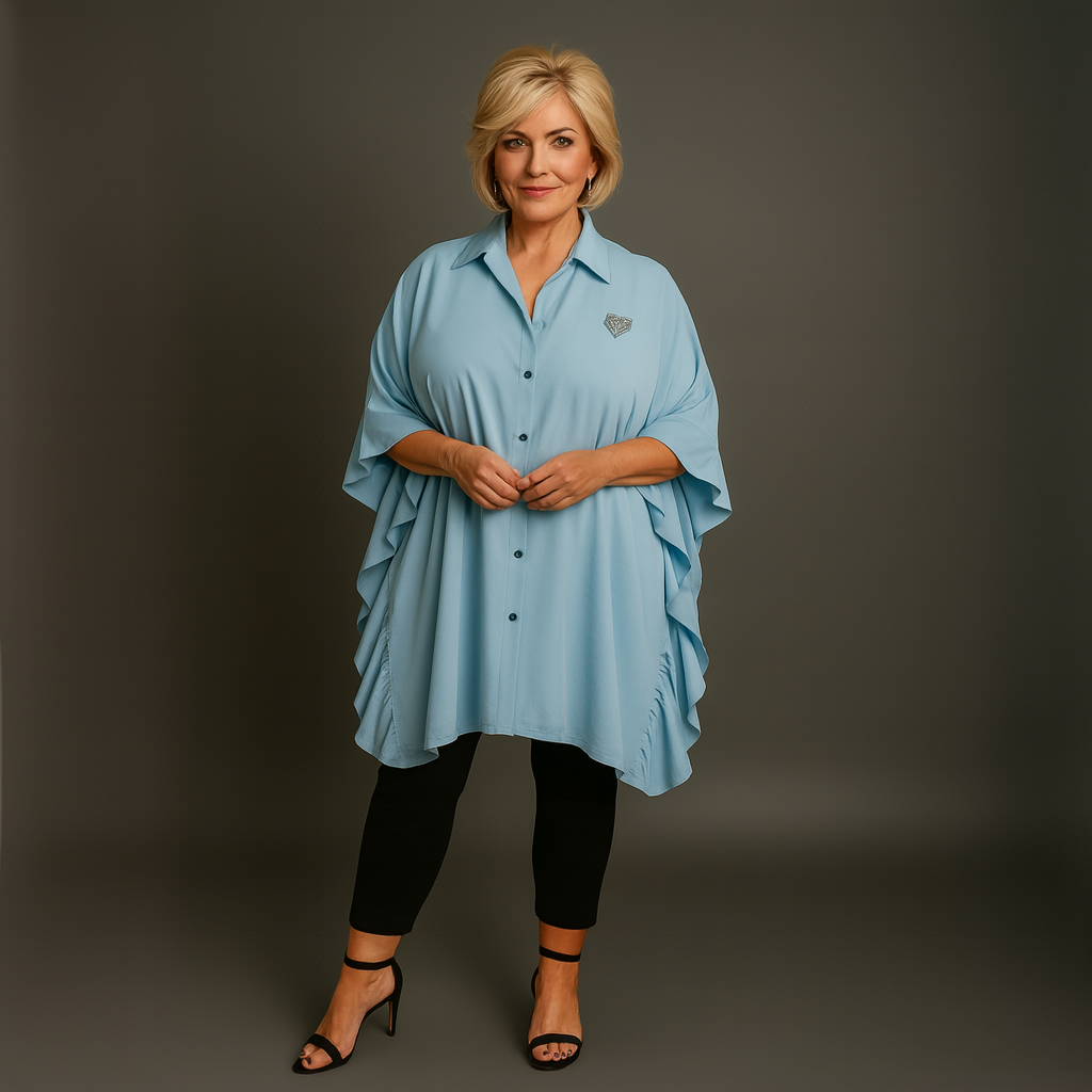 Make a statement with our Oversized Shirt with Frilled Sides and Sparkly Heart, designed to combine standout style with effortless comfort. This original RockThoseCurves design can be worn as a loose jacket or buttoned up as a chic blouse, making it a versatile addition to your wardrobe.