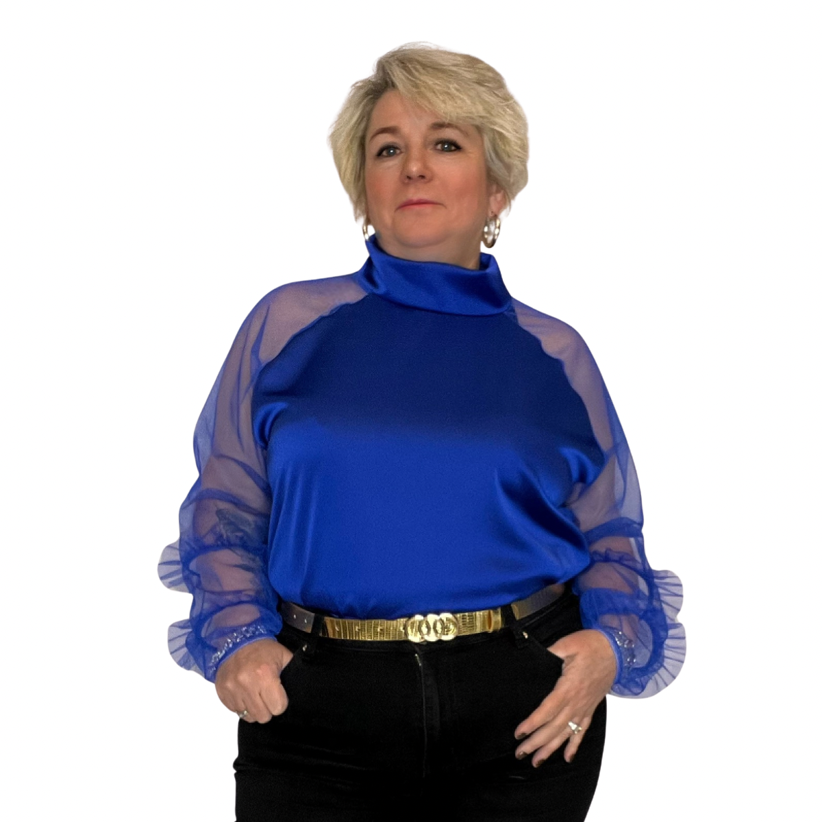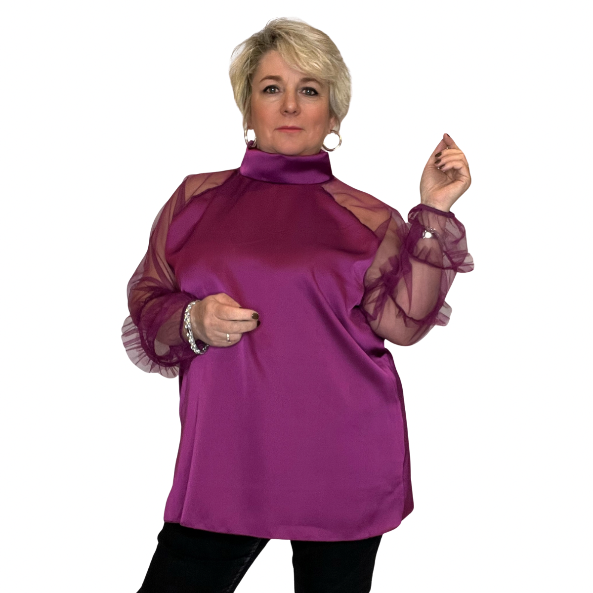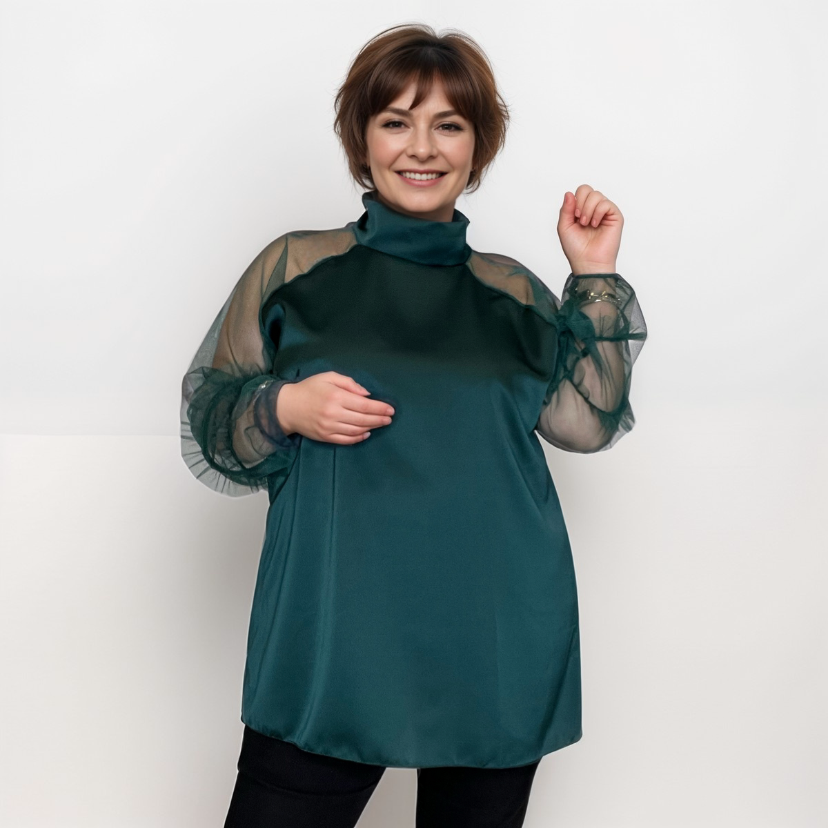 ROCKTHOSECURVES SATIN BLOUSE TURTLE NECK + CHIFFON FRILLED SLEEVES