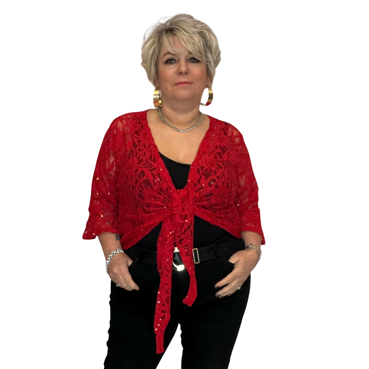 ROCKTHOSECURVES SEQUIN LACE 1/2 BELL SLEEVE TIE FRONT SHRUG / BOLERO JACKET