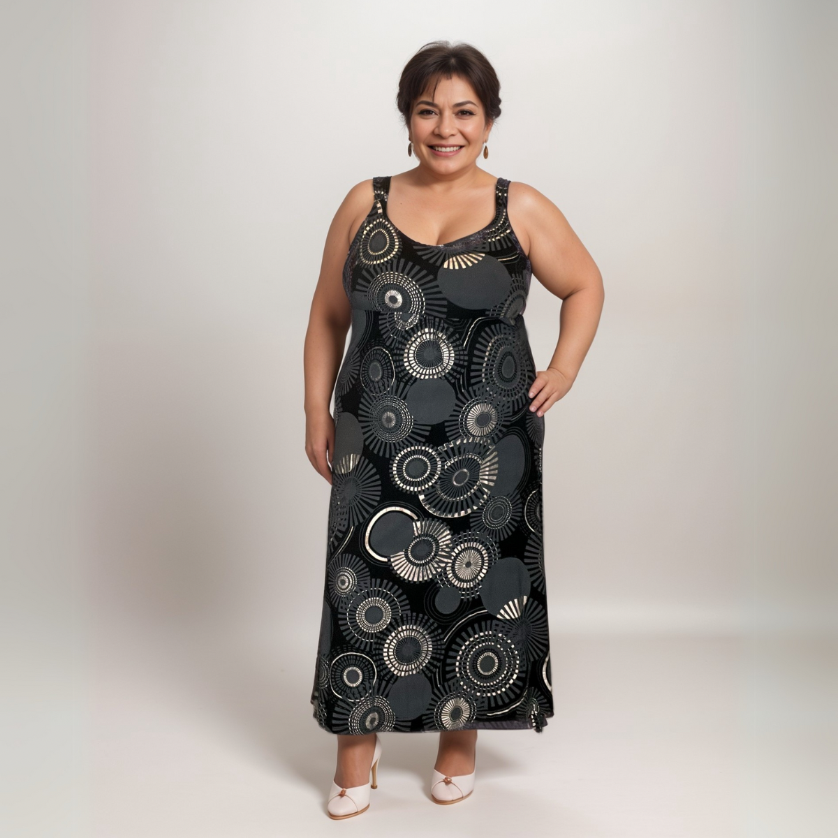This exquisite sleeveless maxi dress features a stunning metallic foil pattern that is sure to turn heads. Crafted from high-quality synthetic material, this dress is not only eye-catching but also environmentally friendly, as it is proudly made in the UK. With a flattering scoop neck and a length of approximately 50 inches, it is perfect for any occasion, whether it be a party, evening out, or holiday getaway. Plus, it comes in a range of sizes to suit all body types. Get ready to rock your curves with this fabulous dress from Rockthosecurves.