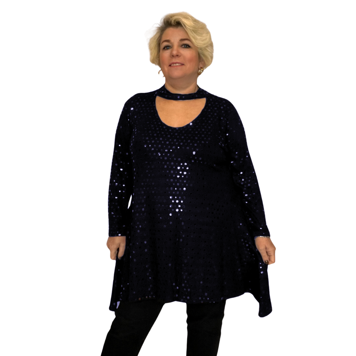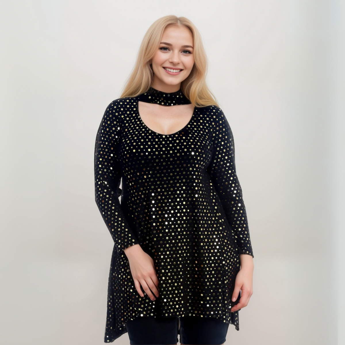 Indulge in the glamorous and flattering style of the ROCKTHOSECURVES BLACK SEQUIN CHOKER NECK LONG SLEEVE SWING TOP. With its sparkly foil SEQUIN finish and party-ready choker neck, this plus size top will make you feel confident and stunning. Elevate any evening look with its long sleeves and irresistible charm.